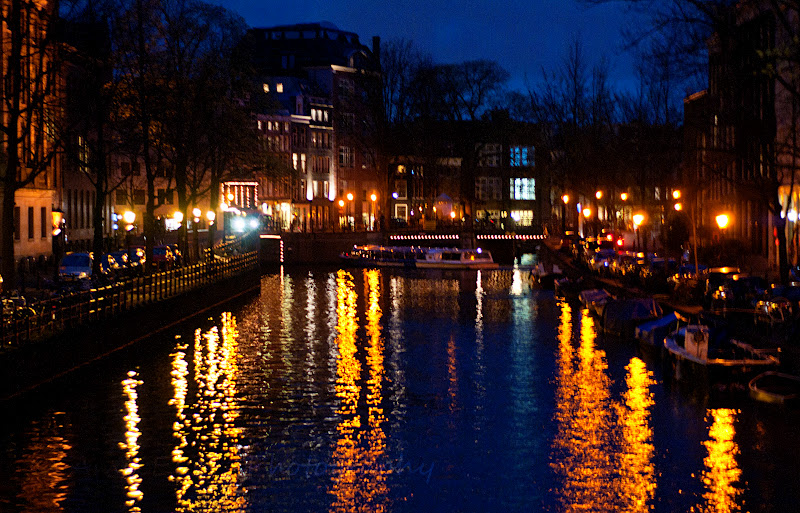 This is one of Amsterdam's canals at night, as we were walking through the 'De Negen Straatjes' (9 streets) area. It was lovely round there - lots of nice cafes and boutiques. I didn't have a tripod with me, so I just had to hope for the best with this shot - it's not as crisp as it would be with a tripod, but not too bad. I love the coloured reflections of the lights on the water.